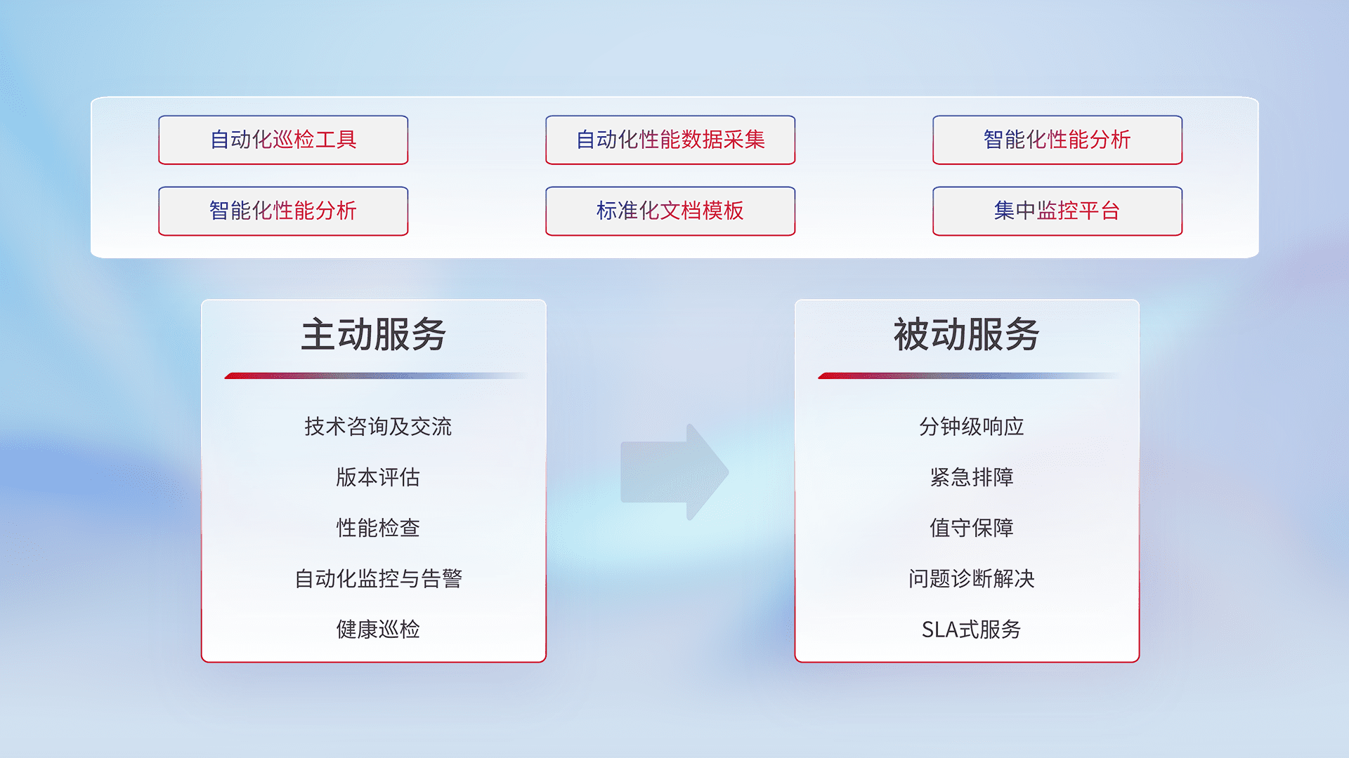 智能化工具和标准化文档,,,保障服务质量,,,,提供主动服务(包含技术咨询、、版本评估、、性能检查、、自动化监控与告警、、、、健康巡检)和被动服务包含(分钟级响应、、、紧急排障、、、值守保障、、、、问题诊断解决、、、SLA服务)。。。。