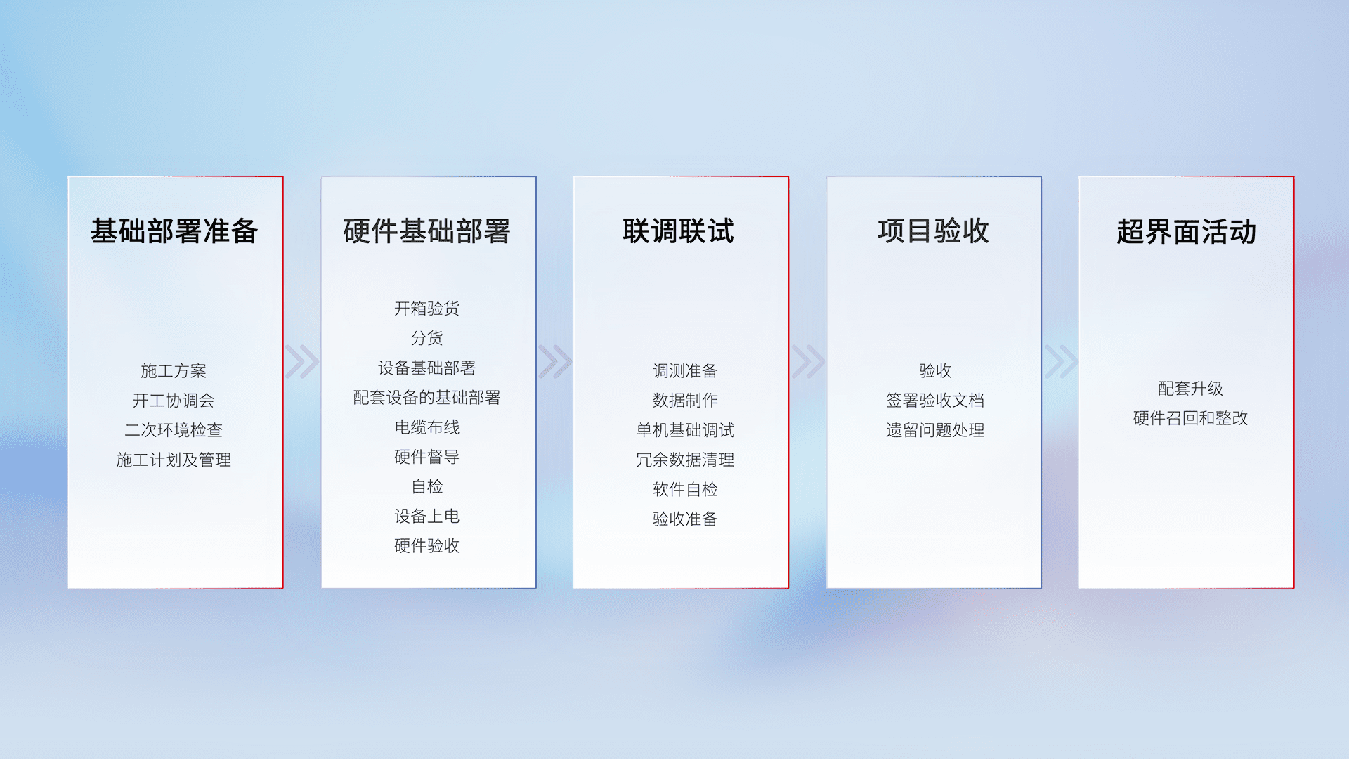 从基础部署准备、、、硬件基础部署、、联调联试、、、、项目验收、、、越界面活动的全过程可追溯,,保证施工质量和进度。。。