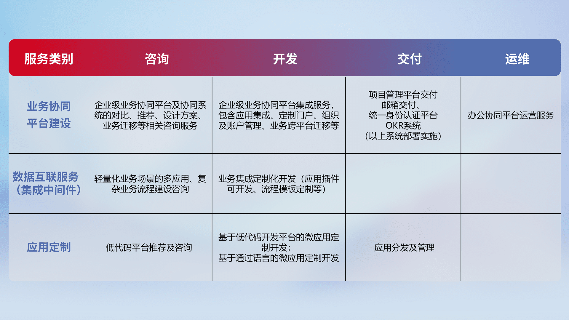针对钉钉、、企微、、IDaas等平台级产品提供产品的规划、、方案、、交付、、、、定制化开发等服务,,,,实现如统一协同办公、、、、智能客户服务、、混合会议管理、、、、智能数据查询、、等业务场景,,,,实现数字化转型。。。。